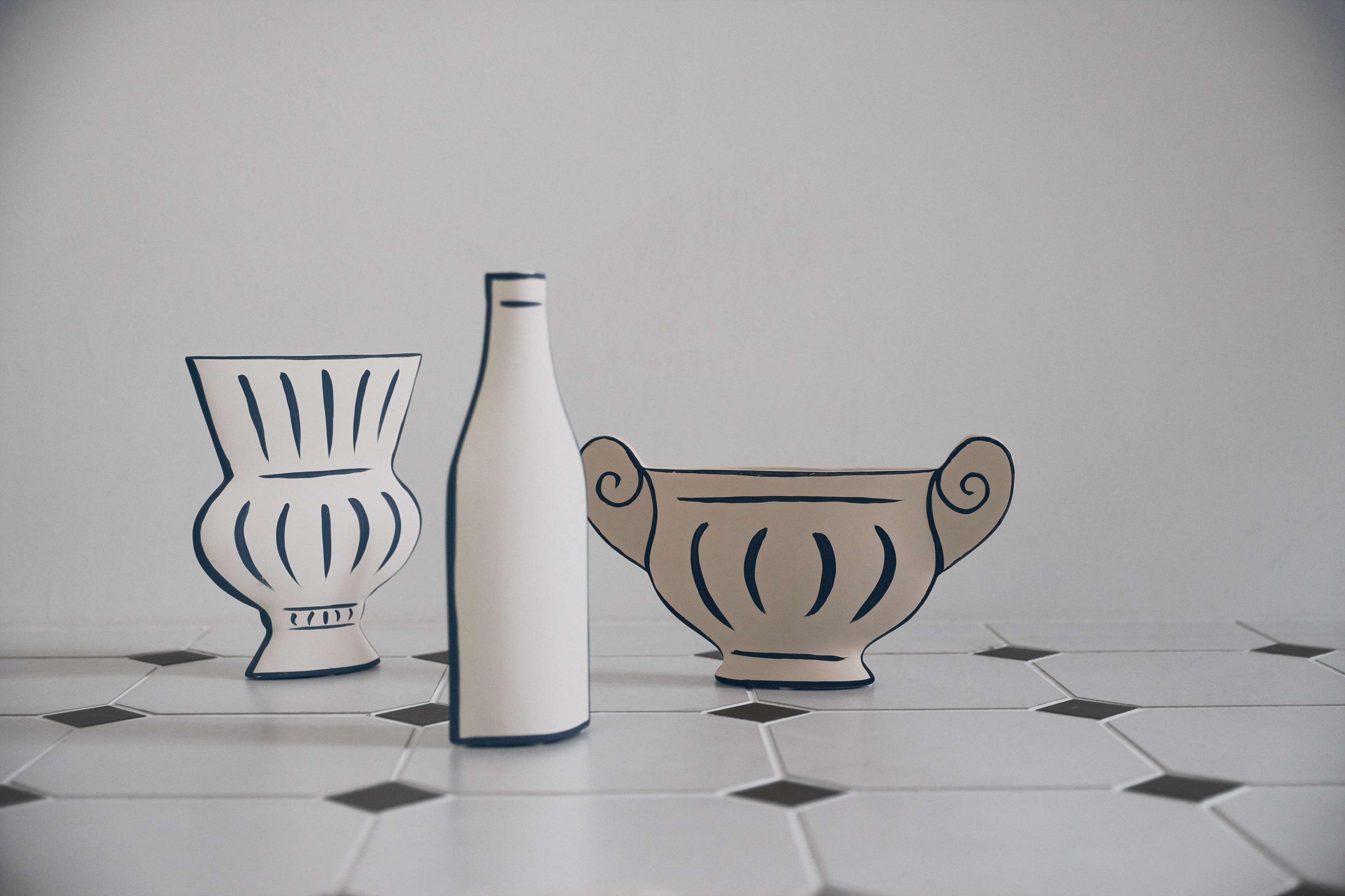 インテリア雑貨コレクション平面的な2Dアートのデザインを、マットな陶器で表現したフラワーベース。職人の手作業による繊細なラインが、モダンなインテリアに程よい温もりとアクセントを加えます。花がない時でも美しい存在感を放ち、飾るだけで洗練された空間へ。日常の風景をアートに変える、遊び心あるセレクトです。