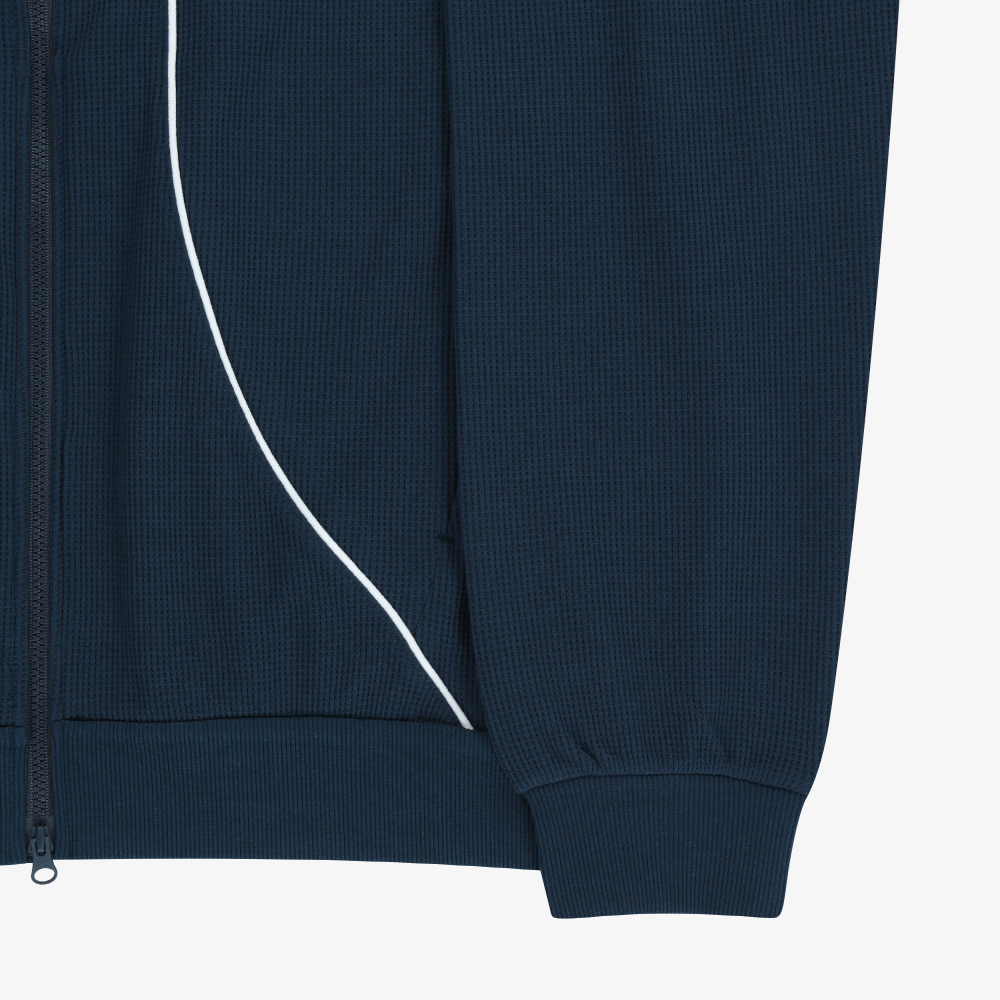 コットンタッチのワッフル生地を使用した、肌なじみの良いジップジャケット。軽やかな着心地ながら、ディテールにこだわった一枚です。