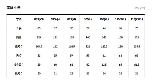 | サイズ | 身長の目安 | 胸囲 | 裾囲 |